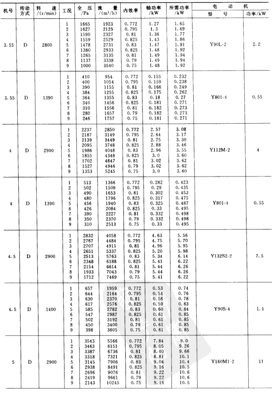 1)本風(fēng)機(jī)為單吸入風(fēng)機(jī),機(jī)號(hào)有No.3.15、3.55、4、4.5、5、5.6、6.3、7.1、8、9、10、11.2、12.5、14等共14個(gè)機(jī)號(hào)組成。